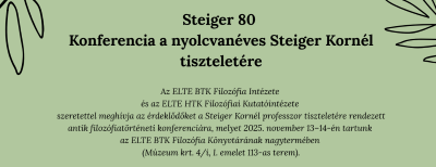 Az ELTE BTK Filozófia Intézete és az ELTE HTK Filozófiai Kutatóintézete szeretettel meghívja az érdeklődőket a Steiger Kornél professzor tiszteletére rendezett antik filozófiatörténeti konferenciára,